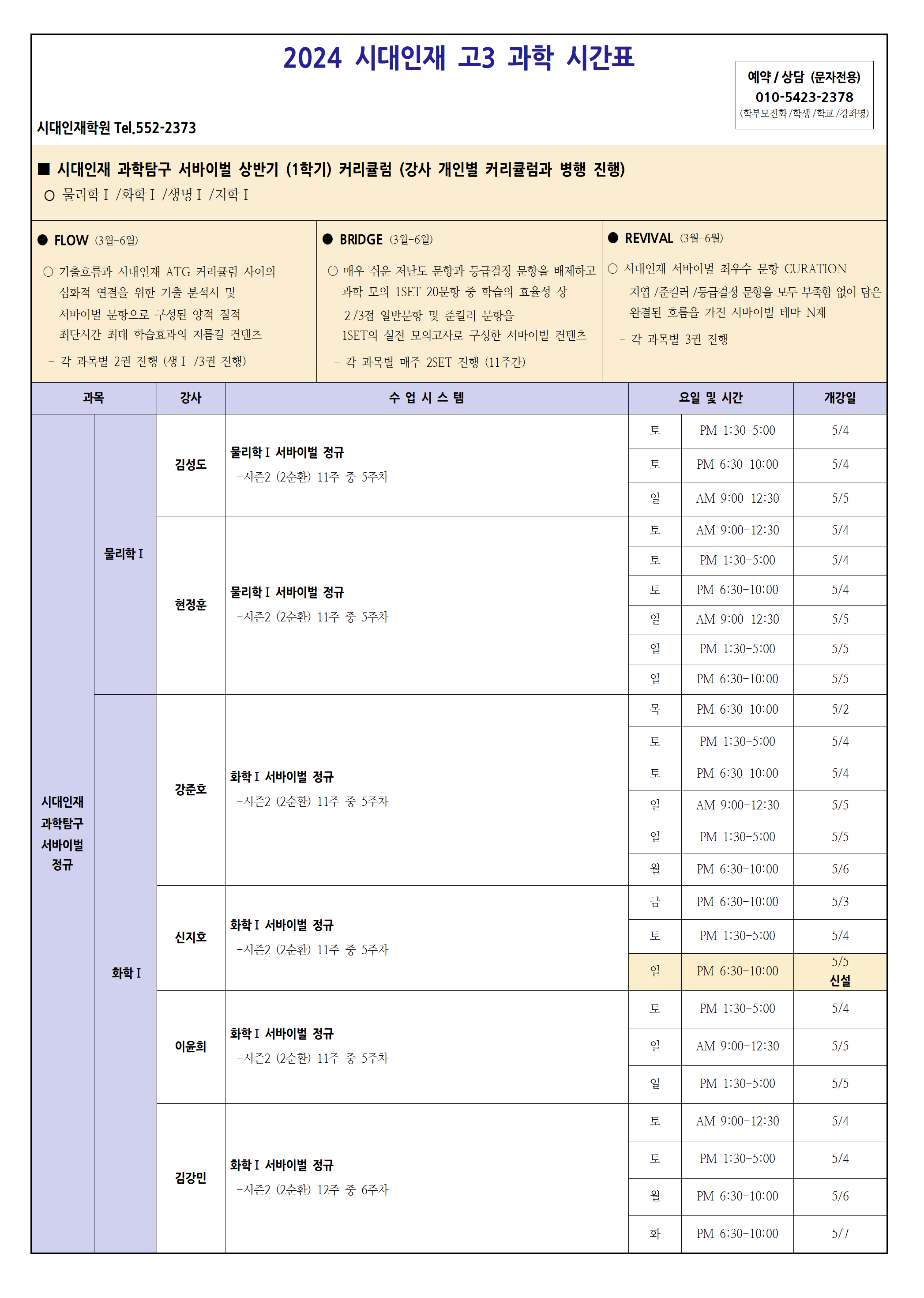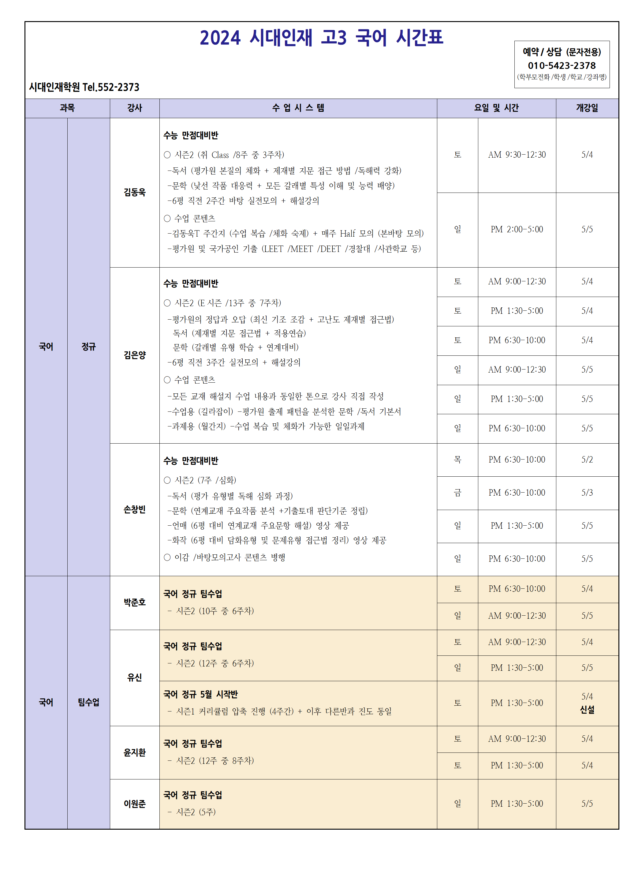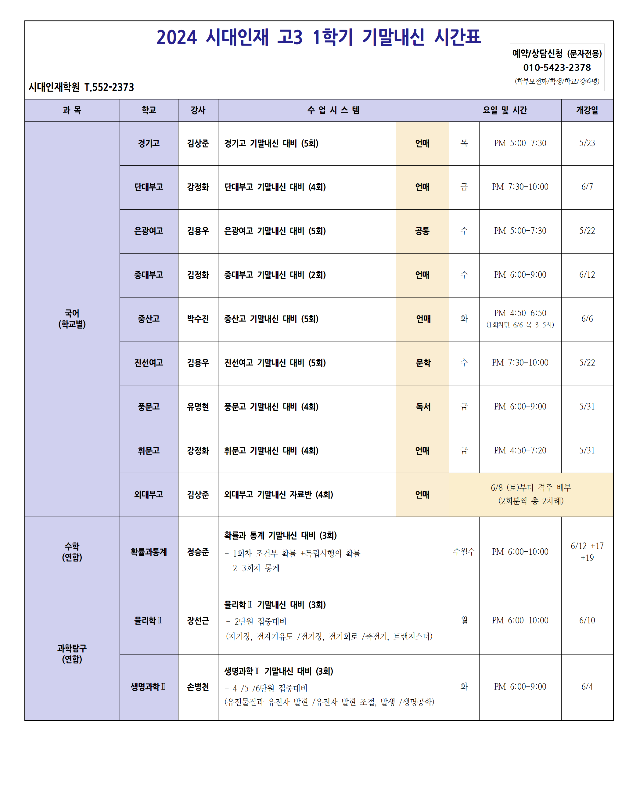 참고로 시간표는 시대 인제에서 한꺼 번에 파학 하기 위 해 참고로 가지고 왔습니다.관심 없는 분들도 입시생이 있다면 한번 읽어 보시면 좋습니다. 큰아이가 시대 인제 에서 국어 공부를 한지도 벌써 2년전 지금은 대학생이 되어 열심이 놀며? 공부 중이니다.그런데 제 발등에 불이 또 떨어 졌습니다. 둘째가 고등 학교 2학년이 되었기 때문 입니다.시간 정말 금방 가네요 시대 인재에 참 많은 선생님 들이 있습니다. 그런데 그거 아시나요 아이와 맞는 쌤이 따로 있다는거 그래서 저는 한달 정도 시대 인제에 나오시는 선생님 들의 인강을 먼저 듣고 아이와 맞는 선생님을 찾으시길 바랍니다.참고로 제딸 아이는 국어 김 은양 쌤과 아이가 참 잘 맞았습니다. 그러니 성적도 쉅게 오르더라구요 아이들 마다 어려워 하는 과목이 존재 합니다. 아이가 대놓고 쌤 실강을 듣고 싶다 하더군요 .바로 찾아갔으나 자리가 없어 예약만 하고 왔습니다. 수시로 전화를 걸어 확인해서 일주일만에 등록을 할수 있었습니다.
