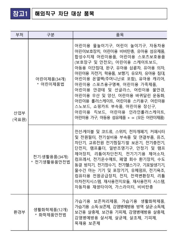 국민들이 구매하려는 제품이 해외 직구가 금지된 제품인지 쉽게 알 수 있도록, 이에 관한 정보는 공정위가 운영하는 ‘소비자24′ 사이트(www.consumer.go.kr)에 모아서 제공하기로 했다.
